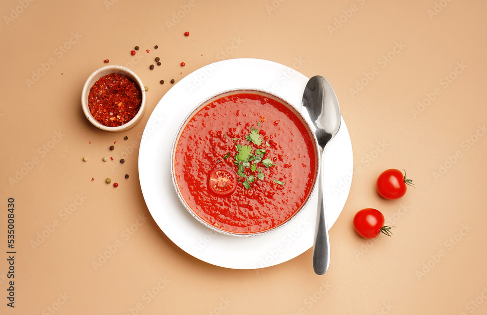 Bowl of tasty tomato soup and spices on color background