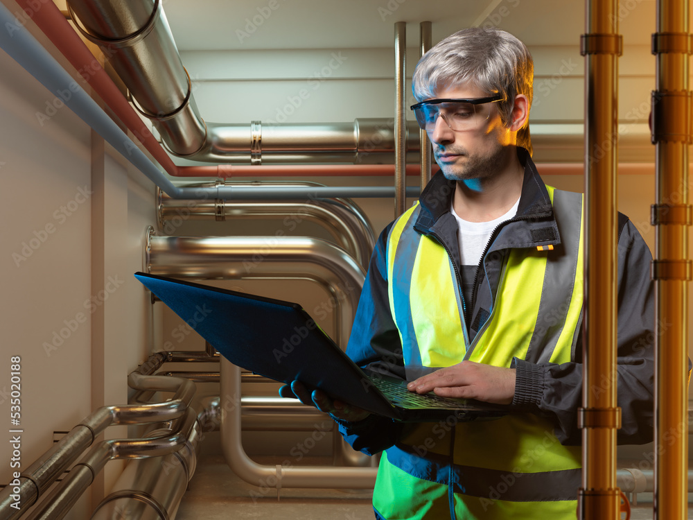 Boiler room engineer. Man with laptop adjusts heating system. Pipes for heating house or factory. Boiler pipeline. Gray-haired engineer in reflective vest. Man adjusting boiler equipment