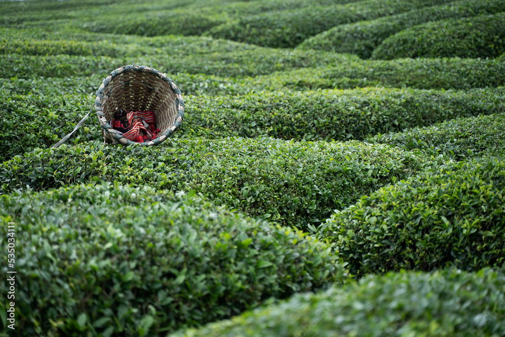 traditional harvesting wicker conical basket on rows of Turkish black tea plantations in Cayeli area Rize province