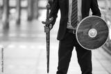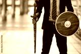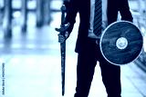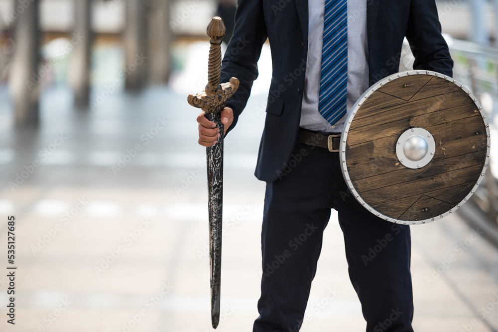 2023 New Year, Business Warrior, Business Man holding sword and shield get ready to fighting in business war.