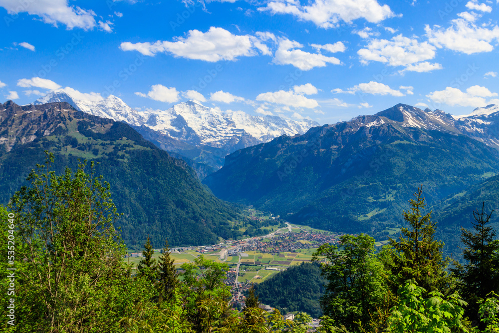 Breathtaking aerial view of Interlaken and Swiss Alps from Harder Kulm viewpoint, Switzerland