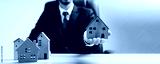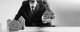 Businessman holding wood house model, bet offer and low interest concept for real estate property insurance concept