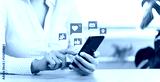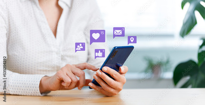 Social media network concept. Woman hand using smartphone with technology icon of social media.