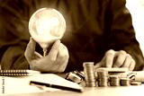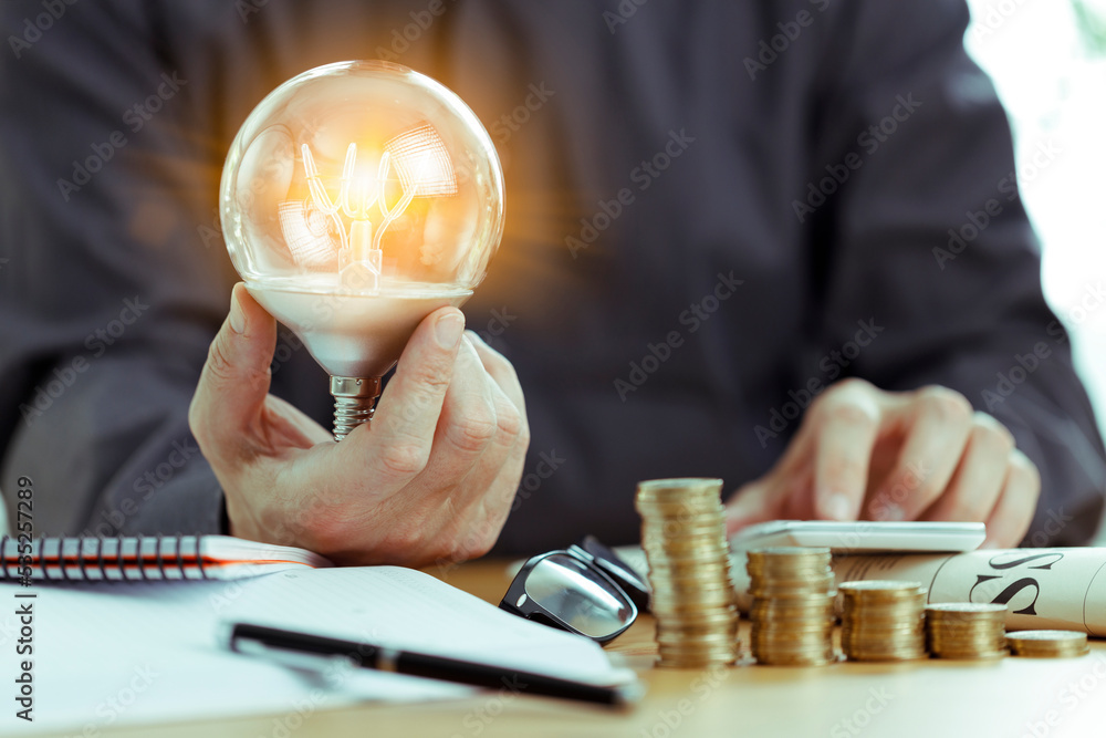 Business man hand holding lightbulb with using calculator. Saving energy and accounting finance concept