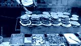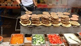 Chef cooks Pljeskavica, grilled spiced meat mixture of pork,lamb and beef with hamburger shape. Trays of sauces and vegetable in front. It' a dish very popular in the Balkans of serbian origin,