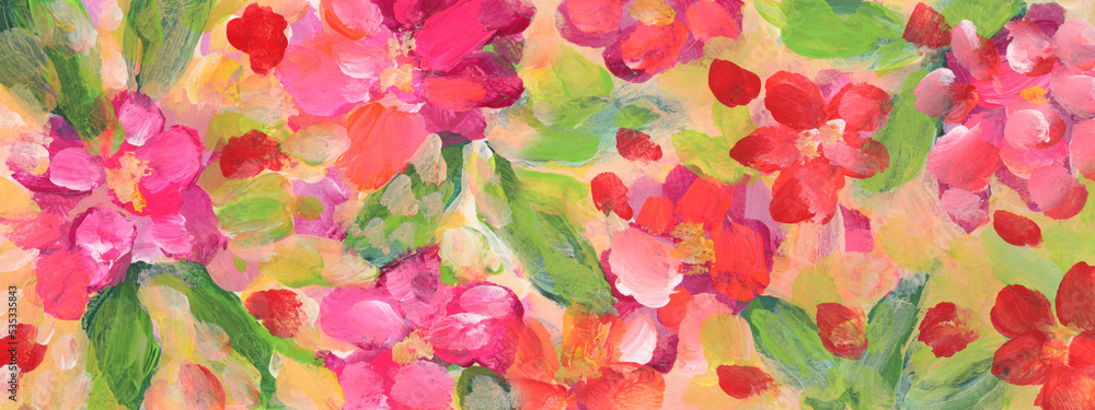 Art Oil and Acrylic flower smear blot painting. Abstract texture color stain horizontal long wall background.