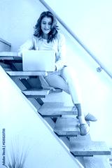 Front view of ginger young woman sitting on the stairs and working on laptop