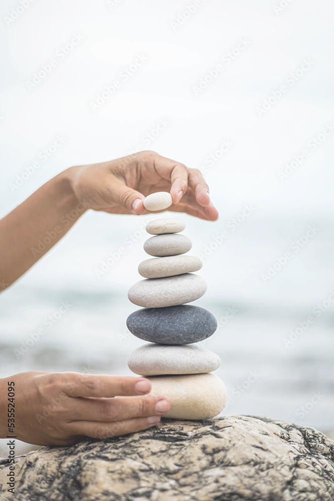 Tanned woman hands stacked pebble stones tower on sea beach relaxing harmony summer travel vacation