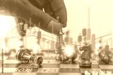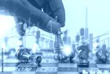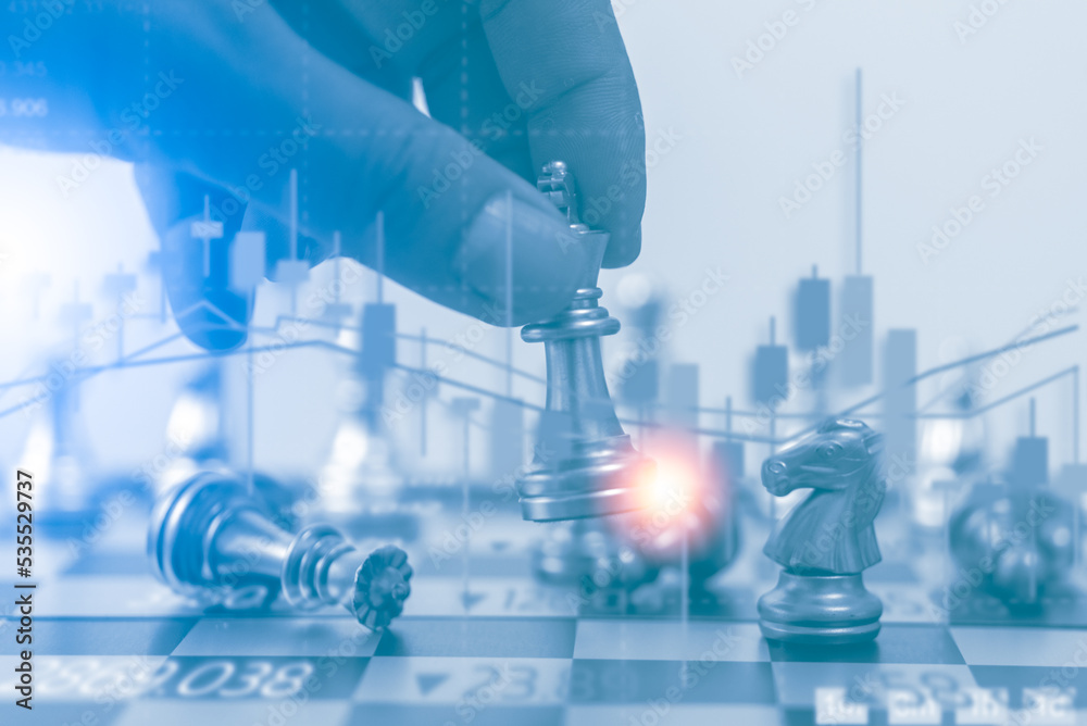 Finance investment man holding a chess board with the strategy stock leader marketing graph operating trade market victory challenge management business concept.