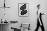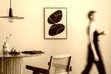 Warm and cozy interior of living room space with mock up poster frame, round table, chairs, pedant lamp, rattan chairs and walking young woman. Minimalist home decor. Template.