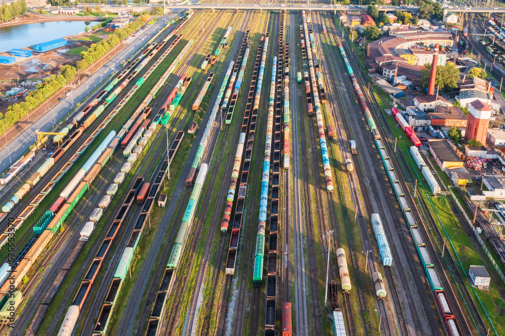 Trains from above. Aerial Top view to railway cylindrical tank shipping containers Rail way. Striped creative transport industry representation. railroads and freight trains to transport cargo.