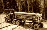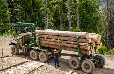 Lumberjack with modern harvester working in a forest. Forest industry. Wheel-mounted loader, timber grab. Felling of trees, cut trees, forest cutting area, forest protection concept