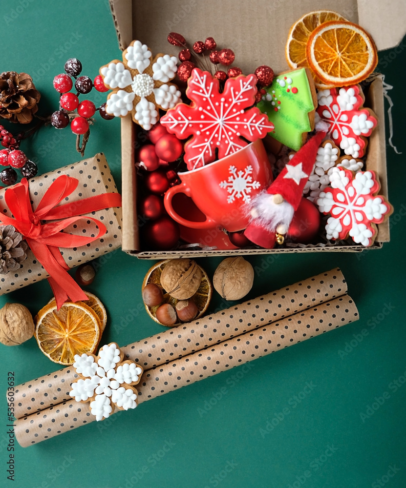 seasonal gift box with christmas decor, gingerbread cookies, cup, nuts, dry orange slices, wrapping paper on green background. gift idea for family and friends. Christmas holiday concept. top view