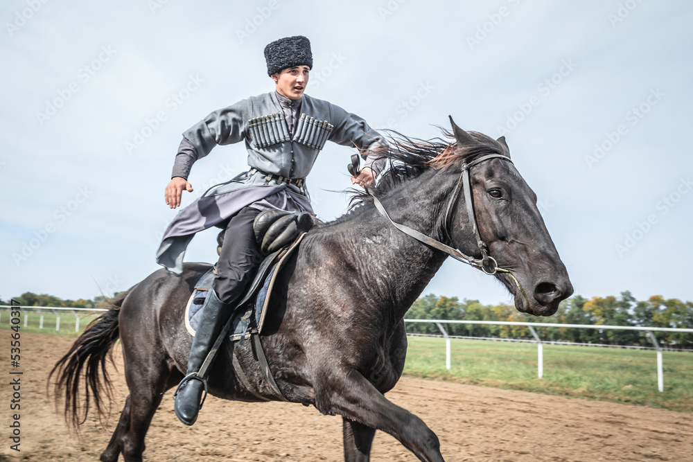 Cossack man in a national costume is galloping rapidly on a black horse around the hippodrome