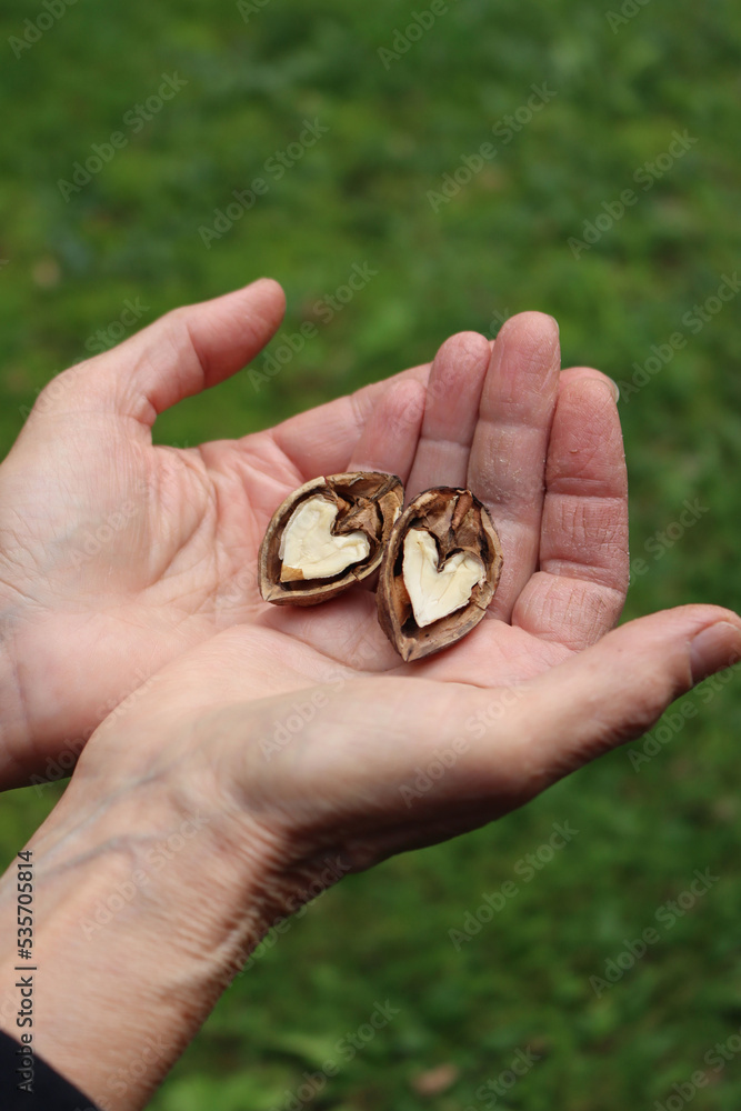 Close-up of old woman hand holding two halves of a walnut in shape of heart against green nature background
