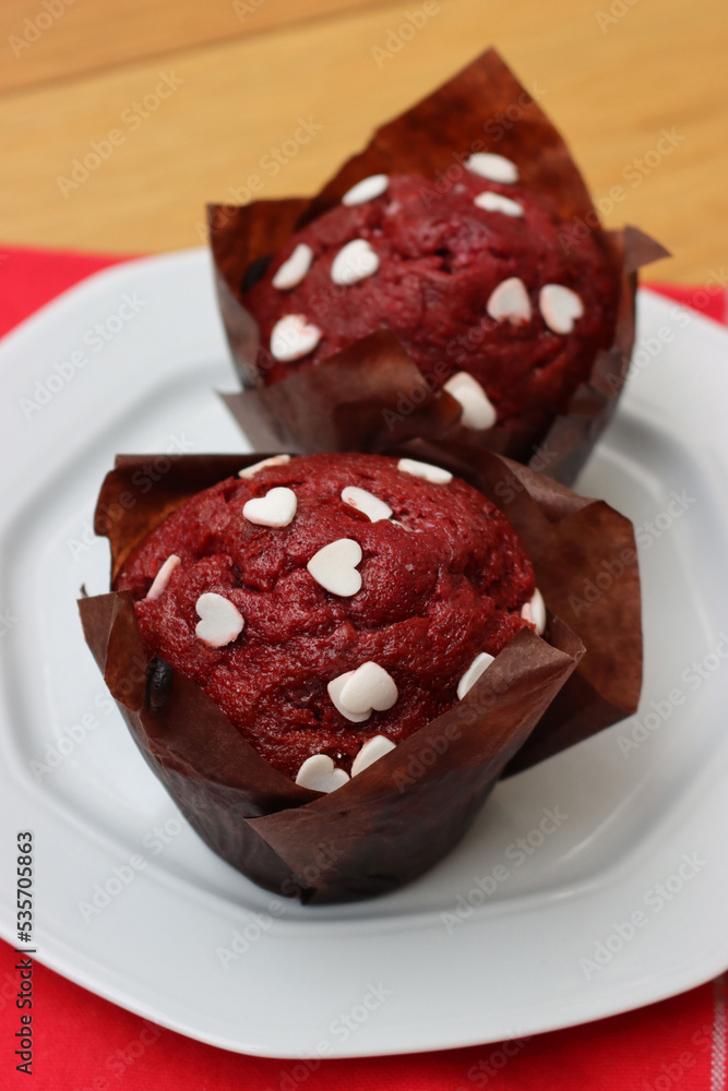 Homemade Red Velvet Cupcakes with white frosting and white heart- shape sprinkles on a red tablecloth on wooden table