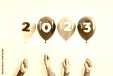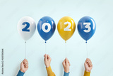New year number 2023 of balloons in hands on blue background.