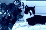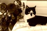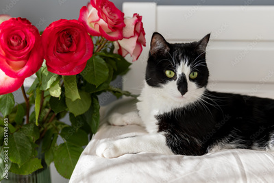 A cute black and white cat lies on a bed near a bouquet of scarlet roses.