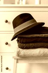Stack of warm wool and cotton clothes with the hat. Textile texture macro close up