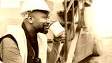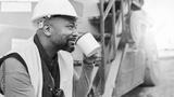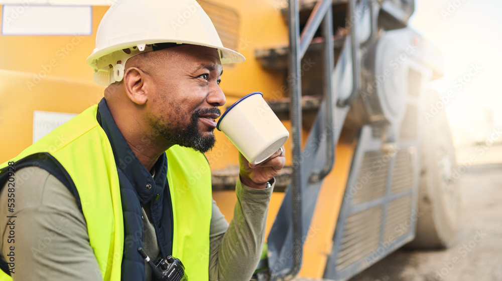 Coffee, engineer and construction worker relax on break at construction site, smiling and inspired by building idea and vision. Engineering, motivation and black man happy about project development
