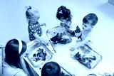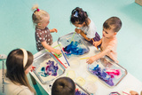kids standing at the table full of watercolors and trying to paint with their teacher, nursery kids' concept. High quality photo