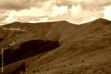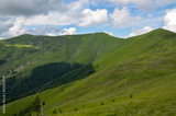 Beautiful bright landscape with grass green meadow and mountain slopes in summer. Carpathian Mountains, Ukraine