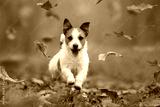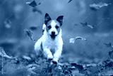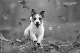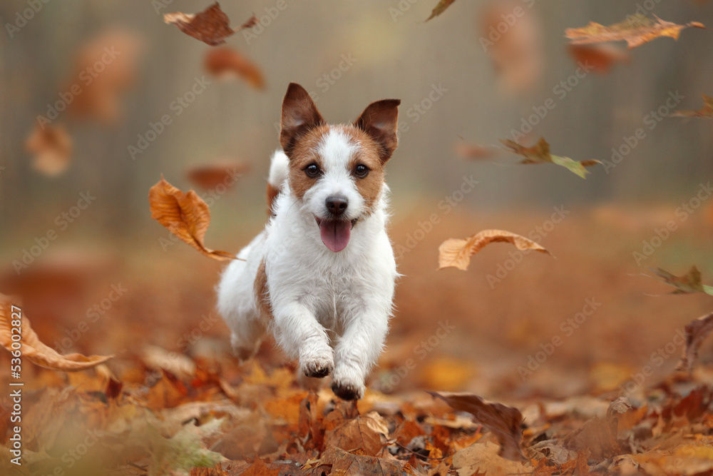 Beautiful dog jack russell terrier runs. dog in autumn leaves
