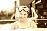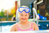 Smiling cute little caucasian girl in outdoor pool in sunny day.