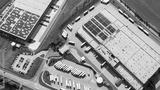 Industry with low carbon footprint. Industrial warehouses with solar panels on the roof. Technology park and factories from above.