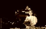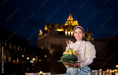 Thai woman wearing thai traditional dresses modern hold kratong,Loy Krathong Traditional Festival by bring Krathong to float in Loy kratong day of Thailand is religion travel concept.