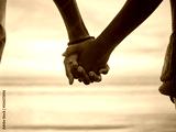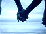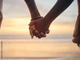 Trust, love and holding hands with couple by the beach together for support, happy and relax on Miami summer vacation. Sunset, vision and nature with black man and woman on peace holiday
