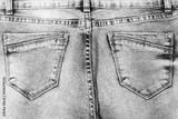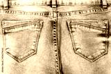 Back side jeans textured pockets background. Blue denim pattern top view and copy space. Template blank backdrop. Fashion cloth pattern mockup. Top view flat lay trousers material. Selective focus