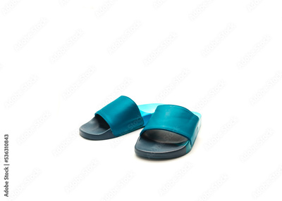 Brand new a pair of blue slide sandals for men with faux-leather upper, comfortable foam lining and contoured foot bed isolated on white background