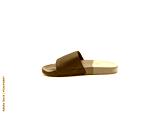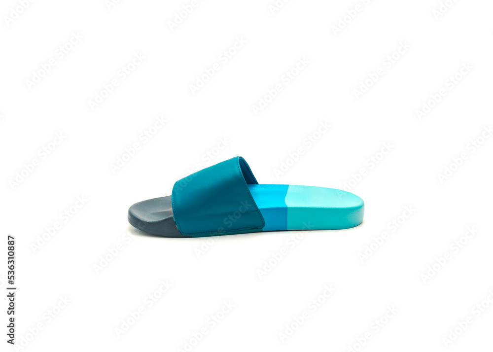Side view single blue slide sandal for men with faux-leather upper, comfortable foam lining and contoured foot bed isolated on white background