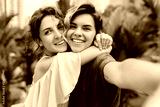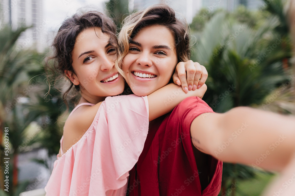 Cute caucasian girl in pink dress expressing love to friend. Outdoor shot of graceful ladies posing together in weekend.