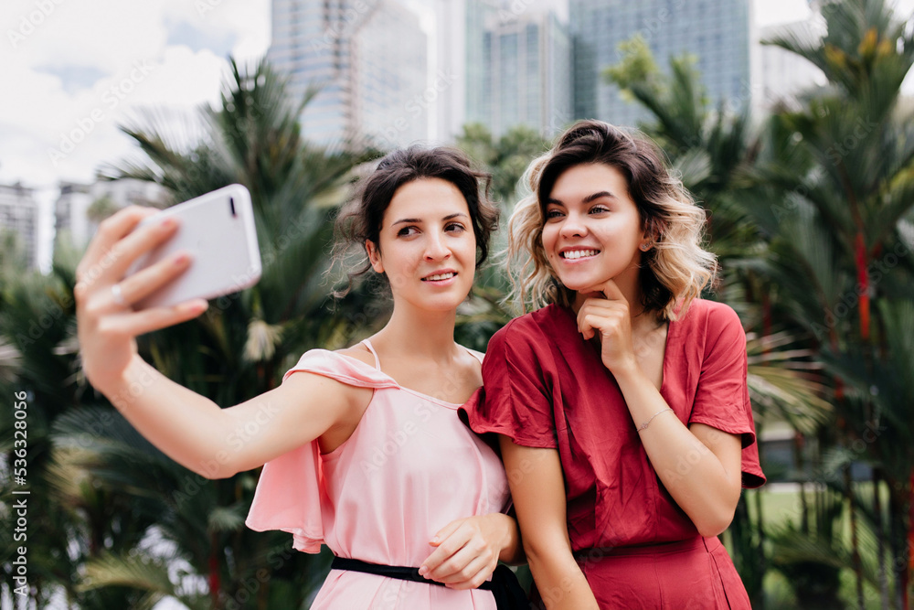 Enchanting woman with blonde hair posing while her friend using phone. Outdoor photo of two glamorous ladies standing on city background.