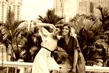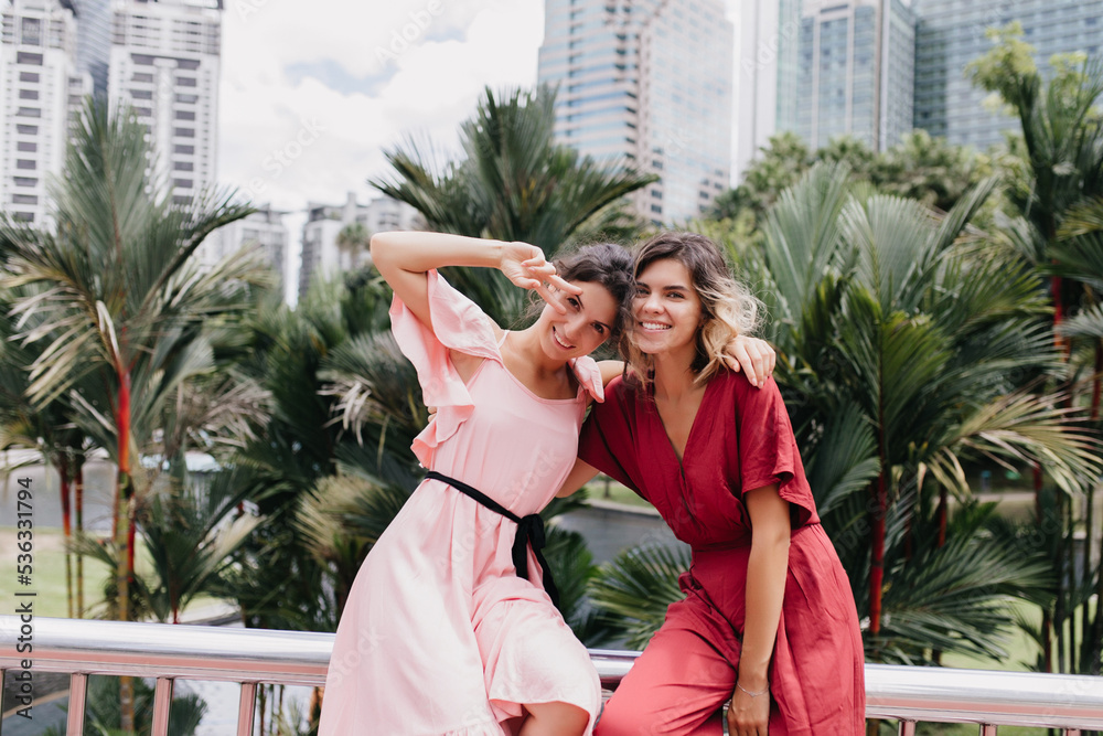 Excited girls fooling around on the street with skyscrapers on background. Outdoor shot of laughing sisters posing with peace sign near palm trees.