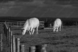 two white cows grazing at sunset during golden hour in front of dark stormy sky in Irish landscape