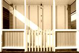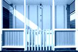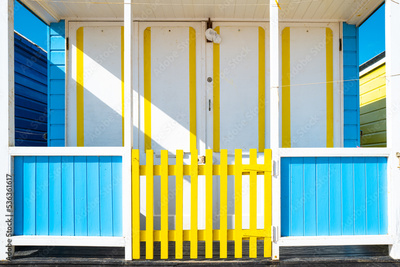 Abstract view of a brightly painted beach hut located by a famous beach on the Suffolk coast in the UK. Seen in a row of painted beach huts.