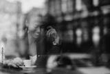 woman in a coffee shop drink coffee viewed through glass with reflections as they sit at a table chatting and laughing