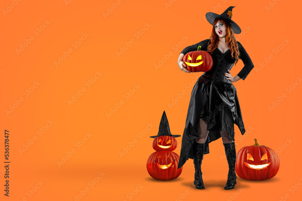 Witch on Halloween. Female wizard fairy character for All Saints' Day. Fantasy gothic red-haired Vampire girl in black dress. Enchantress dressed in carnival costume