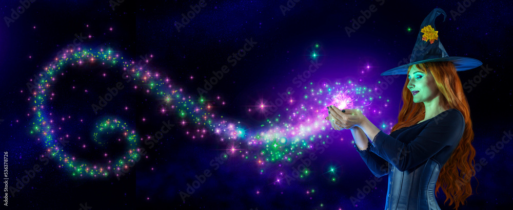 Witch on Halloween. Female wizard fairy character for All Saints' Day. Fantasy gothic red-haired Vampire girl in black dress. Enchantress dressed in carnival costume
