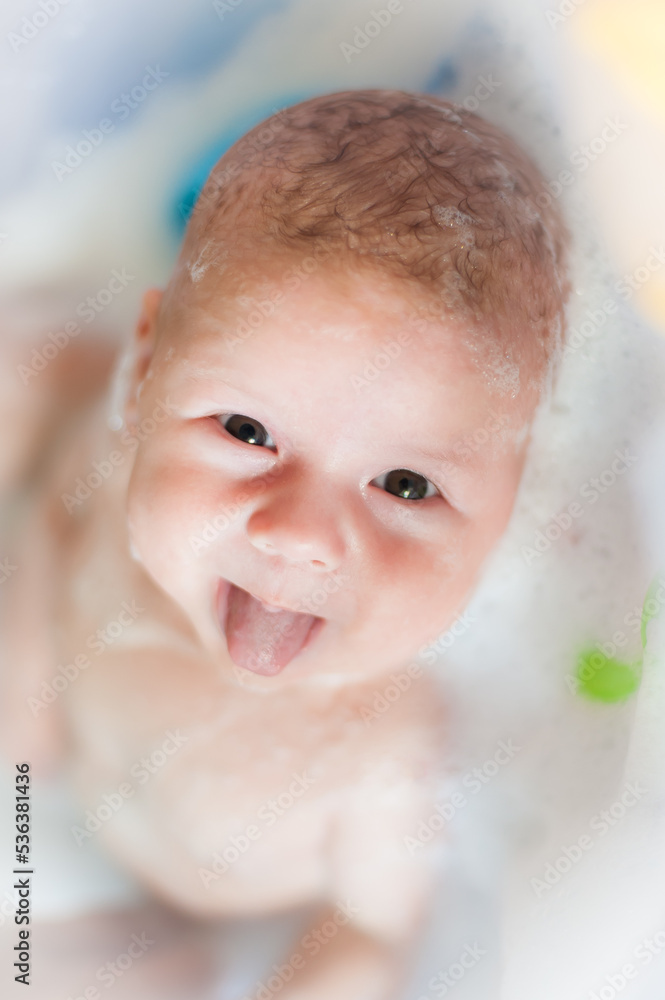 Baby bath time. Close-up detail view of mother bathing cute happy smiling baby in tub with water and bubbles lather