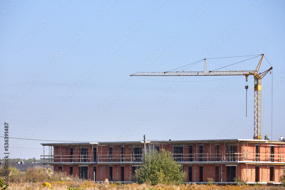 Budowa domu wielorodzinnego w stanie surowym z dźwigiem budowlanym i robotnikami na dachu