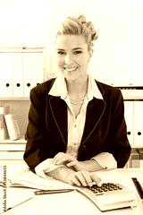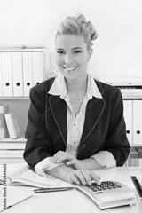 Lachende junge Frau tippt auf einem Taschenrechner im Büro