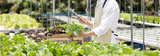 Owner of a small organic vegetable garden uses a tablet to control and direct the supply of water and nutrients or to record the growth of vegetables in the garden, Vegetables in the greenhouse.