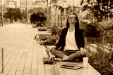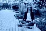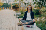 Calm business woman meditating in lotus outdoors, peaceful female freelance employee practicing yoga