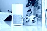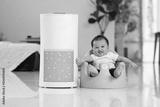 Air purifier and baby smile in cozy white bedroom for filter and cleaning removing dust PM2.5 HEPA and virus in home. Fresh air for baby protect allergy and healthy Wellness life . Baby health care