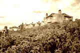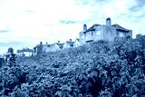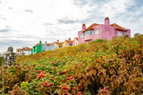 Colourful houses seen looking out to the out of view North Sea. The area suffers from coastal erosion. Beyond the brambles is an eroding cliff.
