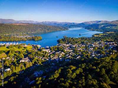 Aerial view of Windermere in Lake District, a region and national park in Cumbria in northwest England